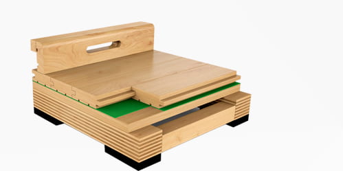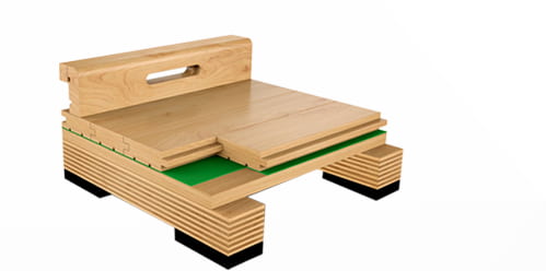 運(yùn)動(dòng)木地板場地的結(jié)構(gòu)由彈性墊層或彈性結(jié)構(gòu)層、彎曲剛性強(qiáng)的載荷分布層(龍骨或毛地板)、面層(面層地板)三層構(gòu)成。